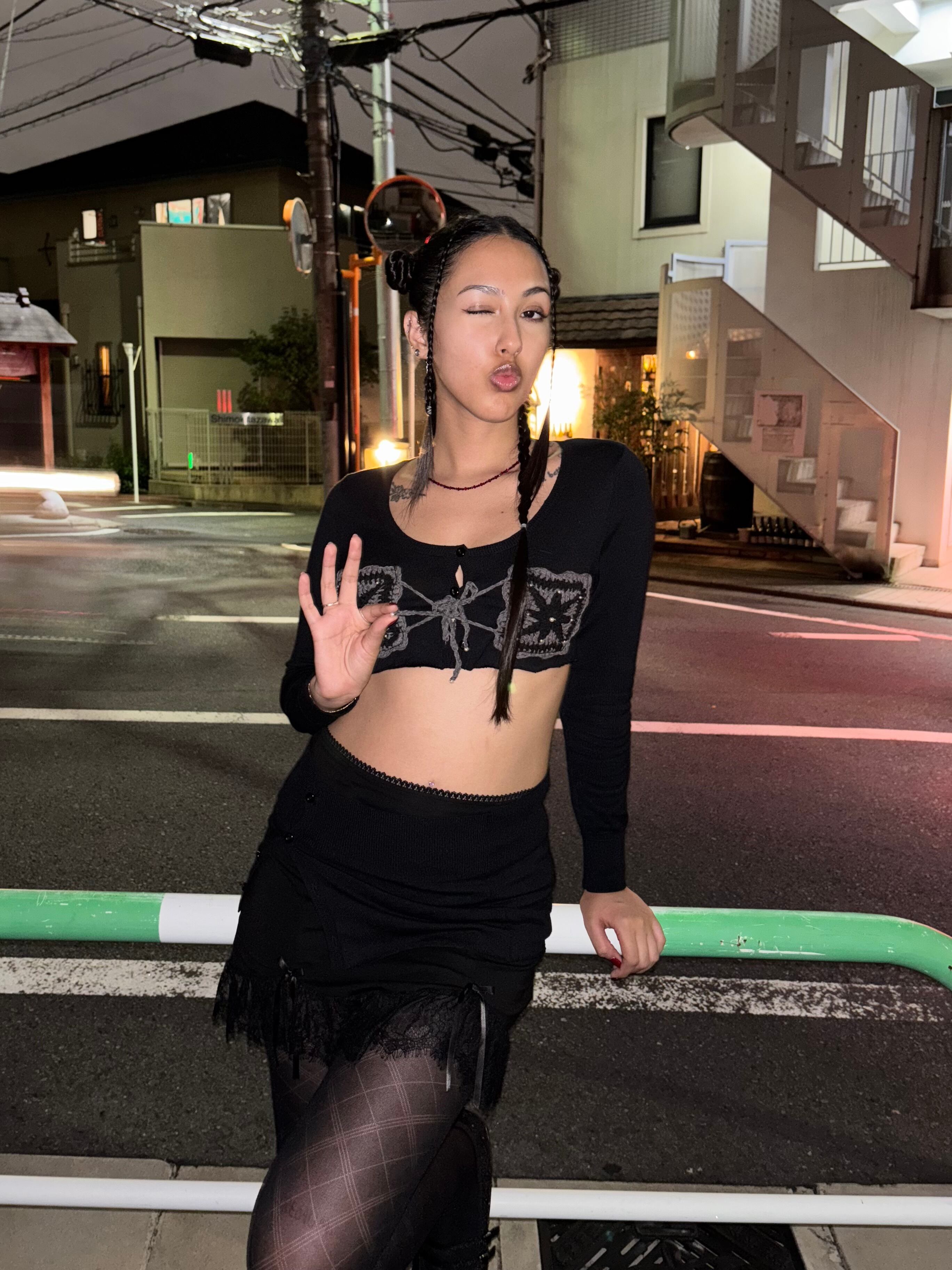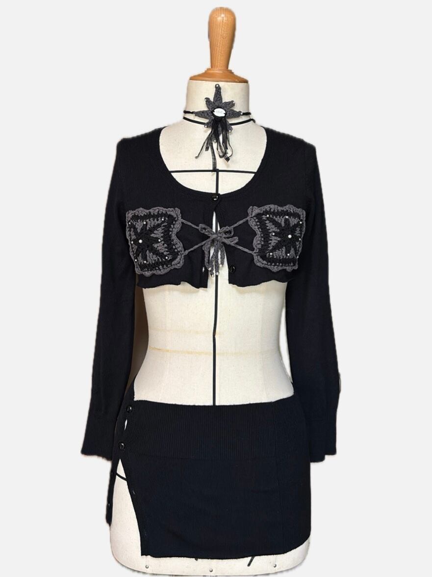 こちらはシンプルなニットカーディガンから、90sバイブスのセットアップピースへとリメイクした作品です。