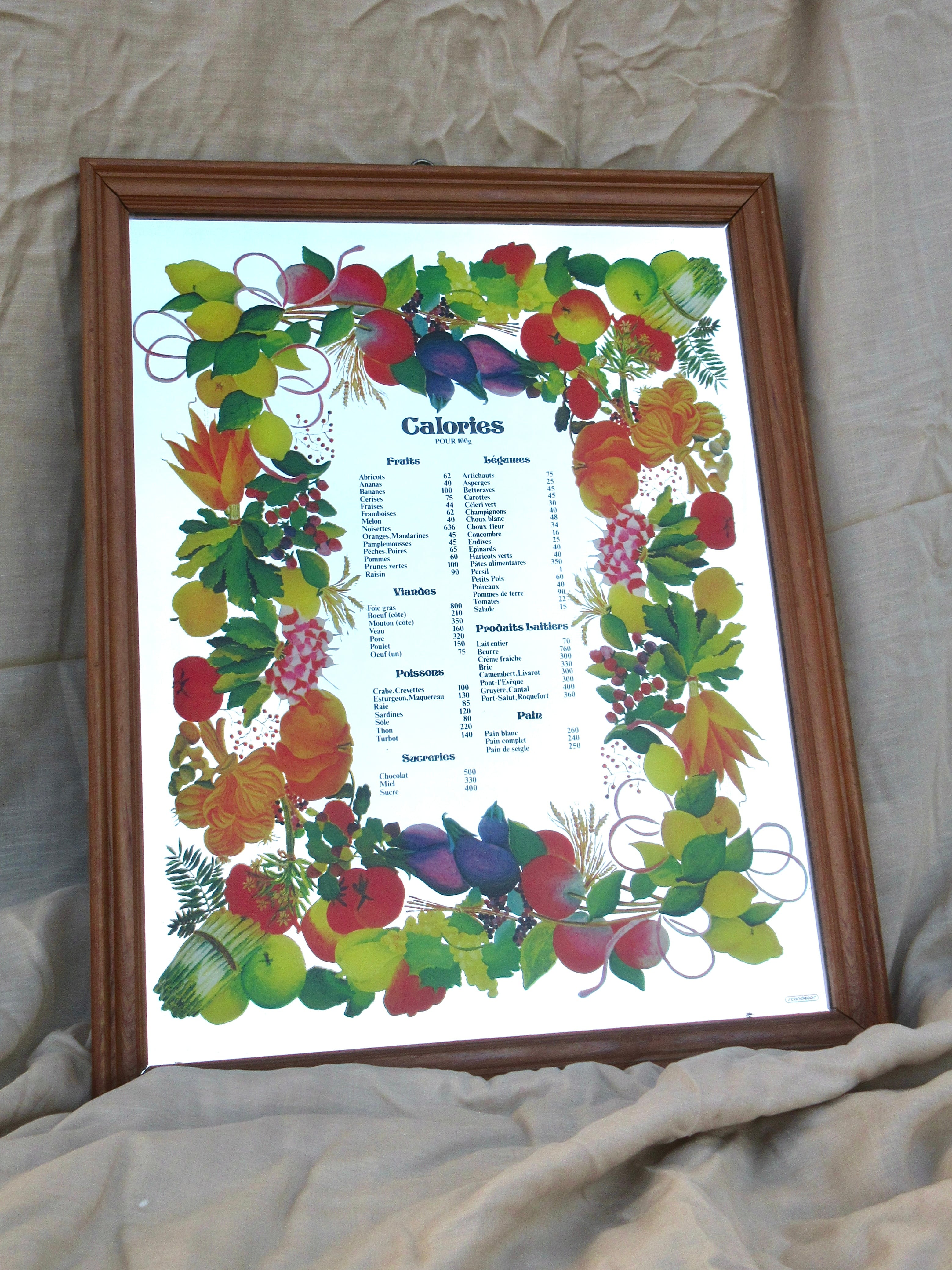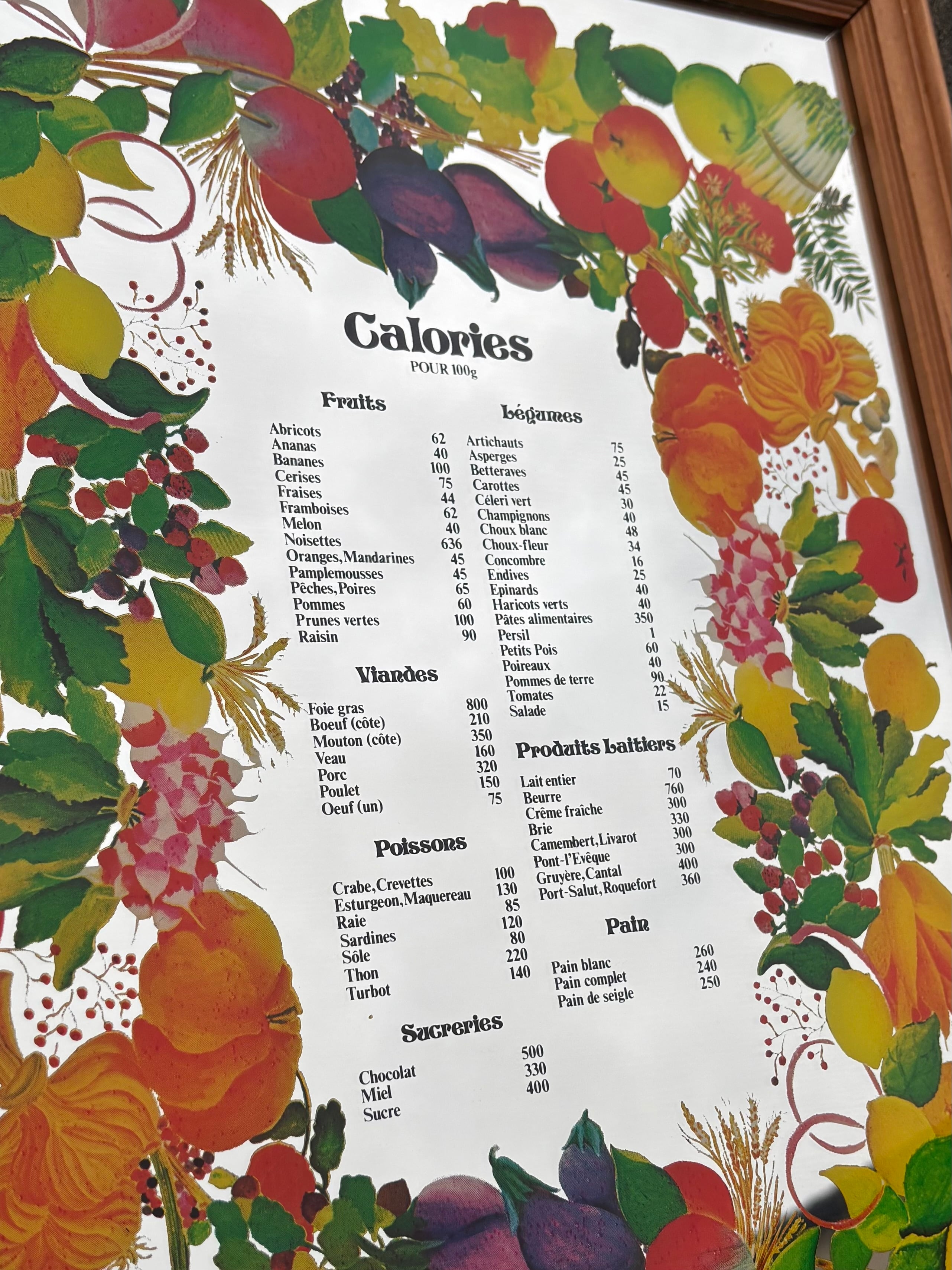 色とりどりの野菜たちのペイントと、お野菜やお肉たちの100gあたりのカロリーがフランス語で描かれています。
