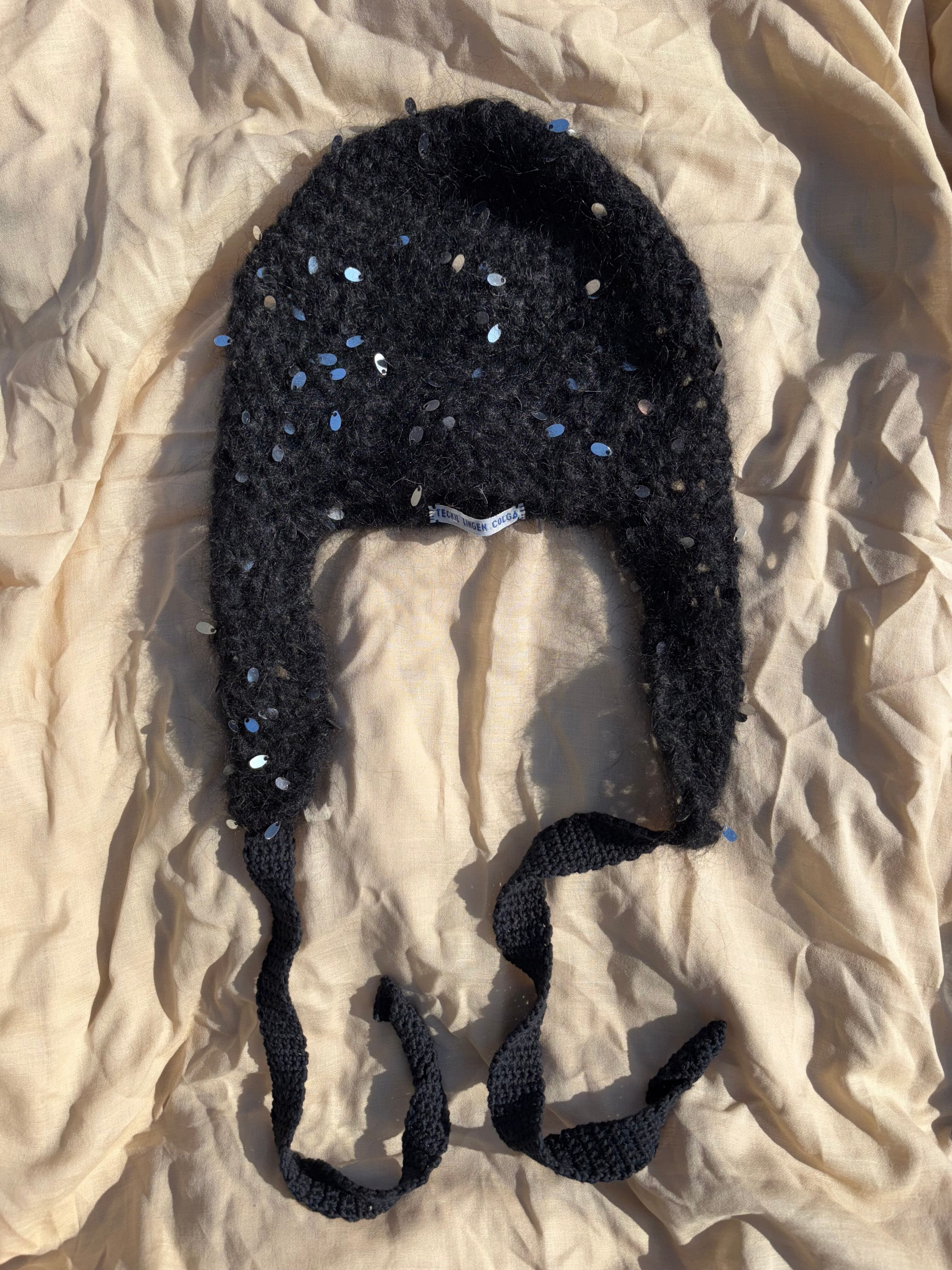 キラキラ輝くスパンコール付きモヘア糸で編みました。