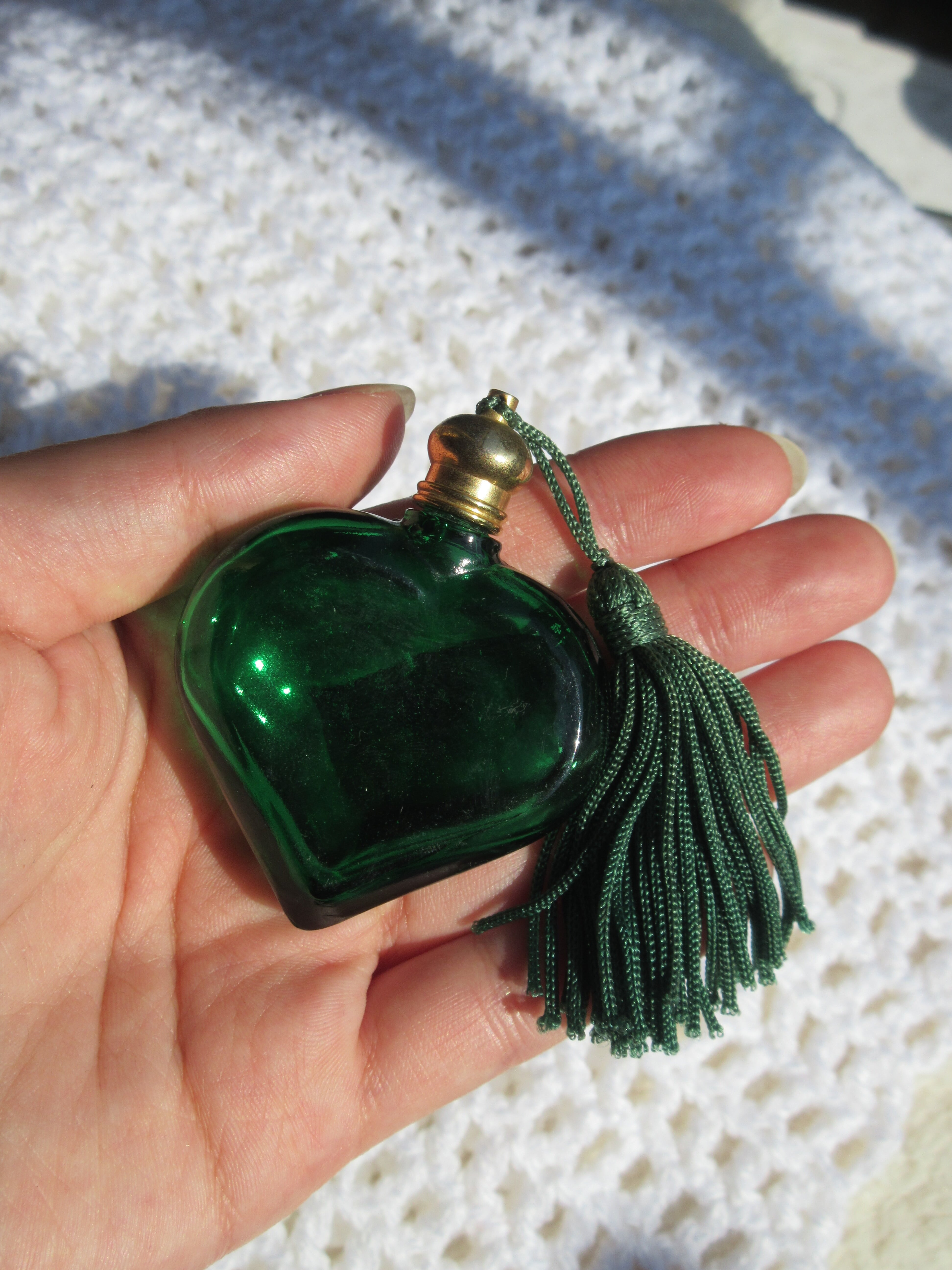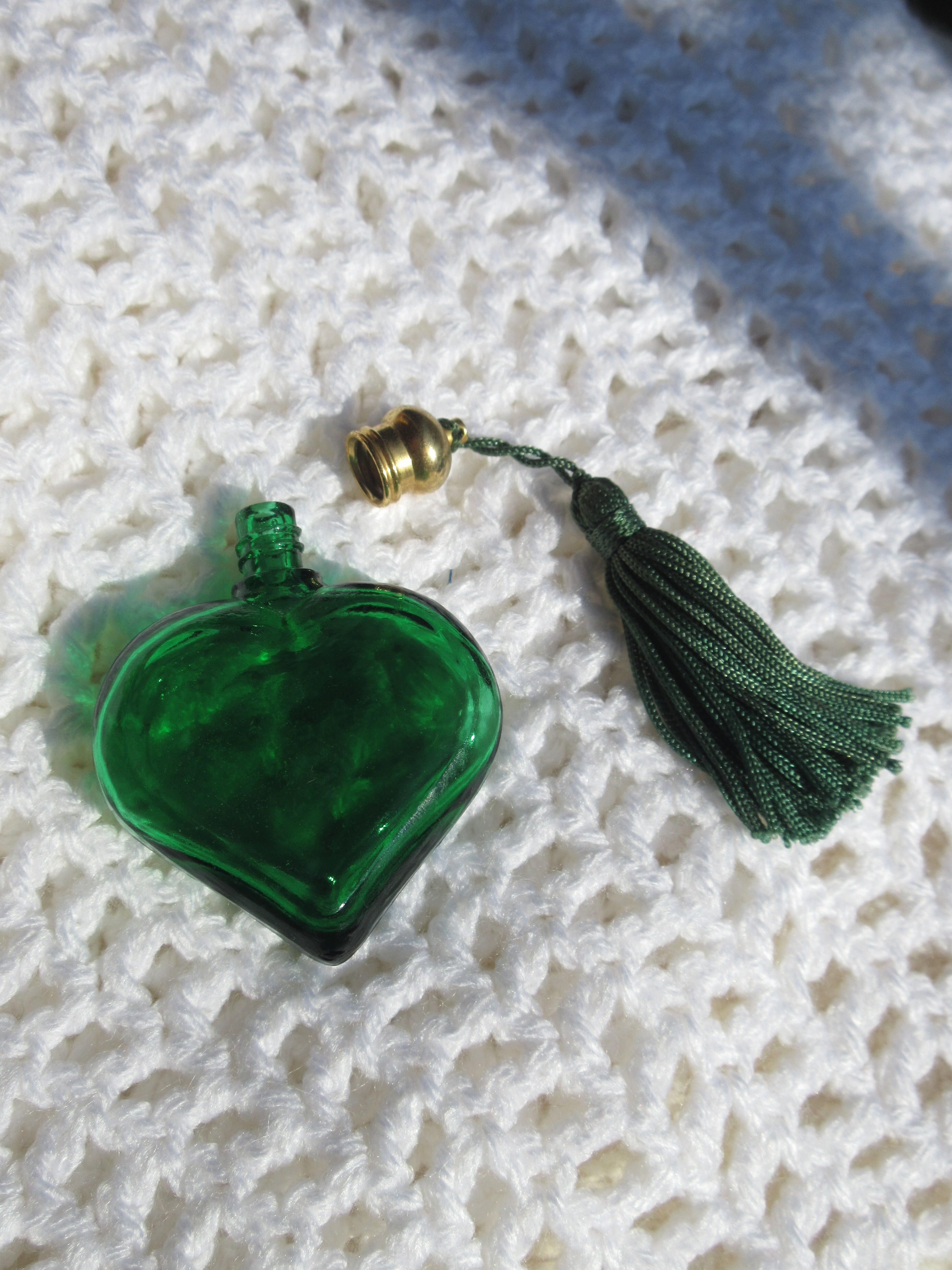 パリの蚤の市で見つけた、タッセル付きの持ち歩き用ハートパフュームボトル。